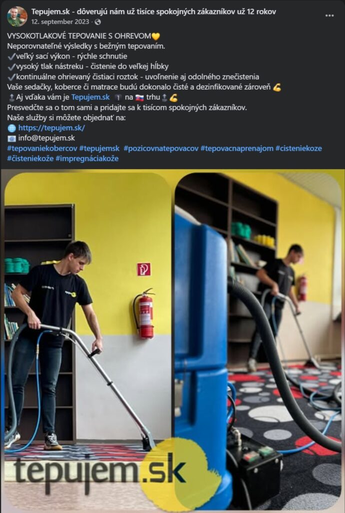 Vždy hľadám spôsoby, ako klienta odlíšiť od konkurencie. V tomto prípade sme si vytvorili novú službu VYSOKOTLAKOVÉ TEPOVANIE S OHREVOM, ktoré konkurencia zvyčajne nemá. V súčasnosti je o toto tepovanie podstatne vyšší záujem ako o čistenie klasické. Zákazníci sa oboznamujú s novým lepším čistením a neradi sa vracajú k bežnému, hoci lacnejšiemu čisteniu.